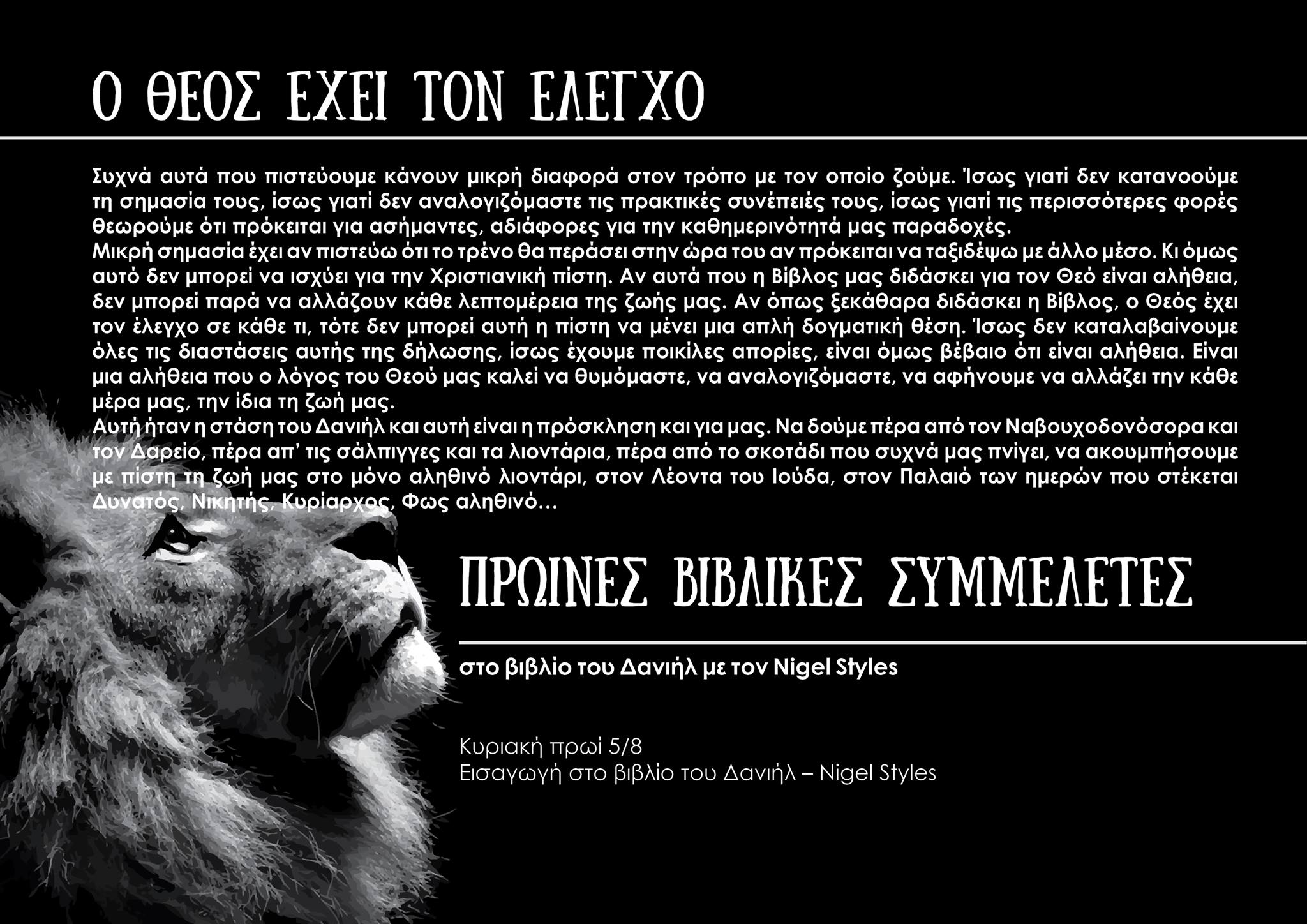 Τα πρωινά θα μελετήσουμε το βιβλίο του Δανιήλ, με τη βοήθεια του αδελφού μας Nigel Styles, διευθυντή του Proclamation Trust Cornhill Training Course στο Λονδίνο, ενώ μέσα από τις απογευματινές ομιλίες θα σκεφτούμε τι σημαίνει για διάφορες εκφάνσεις της ζωής μας ότι Ο ΘΕΟΣ ΕΧΕΙ ΤΟΝ ΕΛΕΓΧΟ σε κάθε τι.